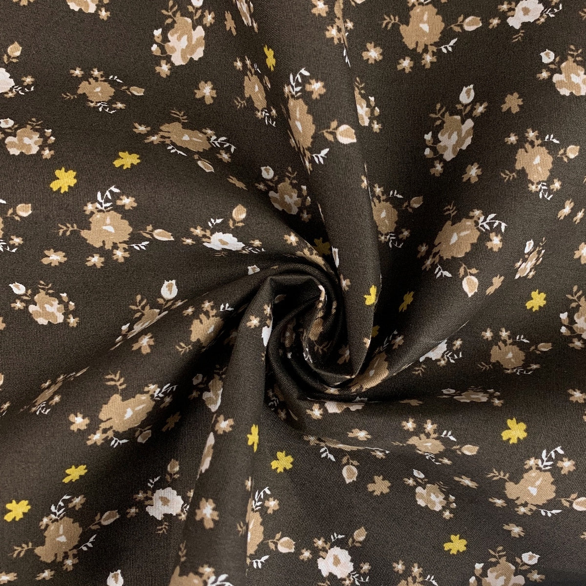 145cm wide Poplin cotton floral dress fabric in brown with an all over white and taupe flower print with smaller yellow flowers too. A similar quality to our narrower poplin prints range this is a lovely cotton material for making dresses, shirts but is also a good cotton for general craft making too. These are also wider than the poplin prints collection of fabrics.