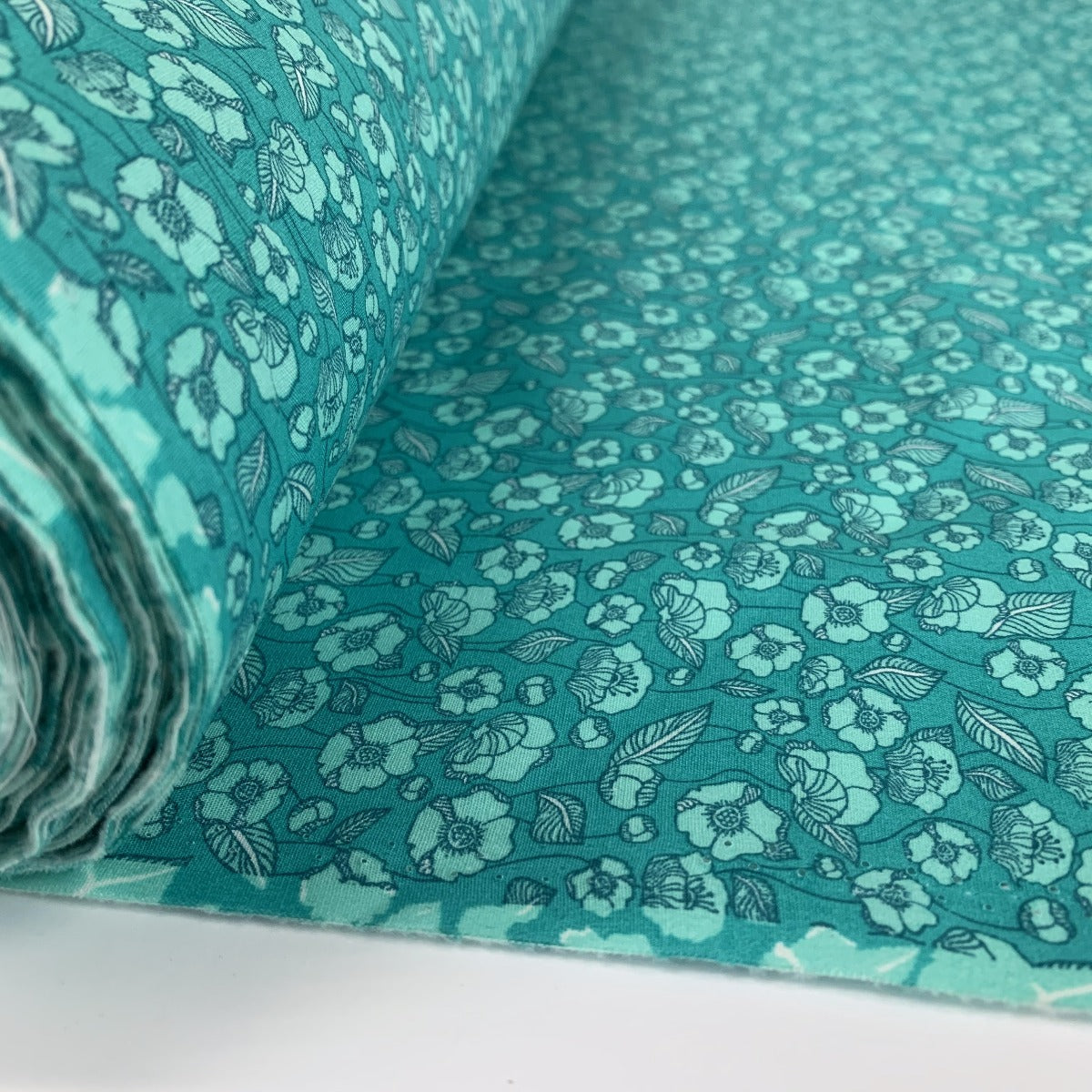 145cm wide Poplin cotton floral dress fabric in a deep rich aqua and Jade. A similar quality to our narrower poplin prints range this is a lovely cotton material for making dresses, shirts but is also a good cotton for general craft making too. These are also wider than the poplin prints collection of fabrics.