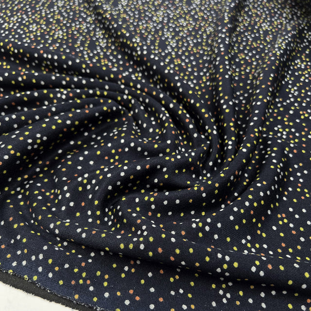 This 155cm-wide Ponte Roma fabric is a stable double-knit with a smooth surface and a soft, fluid drape. The deep navy base is finished with a fine scattered spot, adding quiet detail while keeping the fabric easy to style and wear.