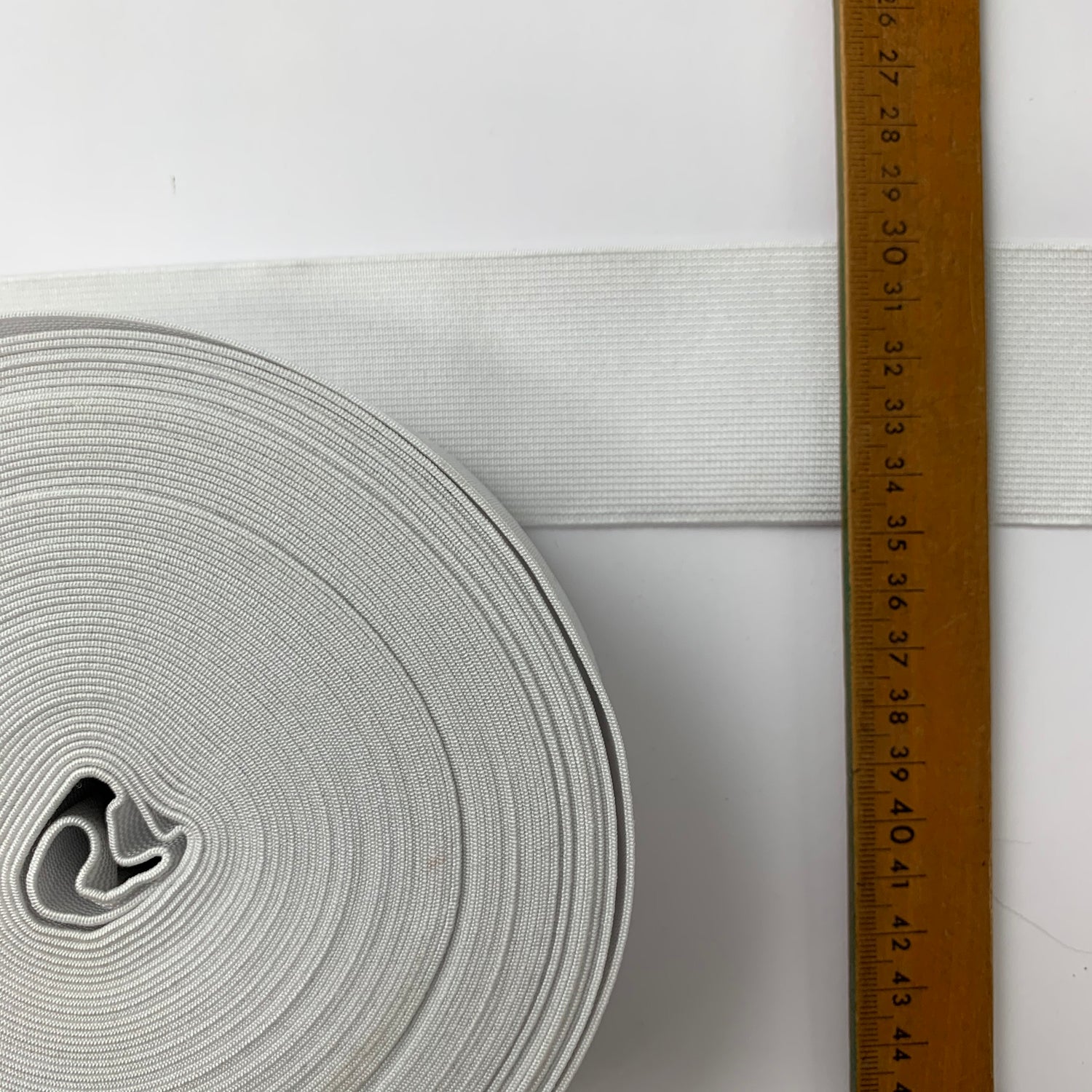 High quality 50mm wide flat loom elastic in white. This elastic maintains its width even when stretched, making it perfect for waistbands, cuffs, crafts, and general sewing projects.