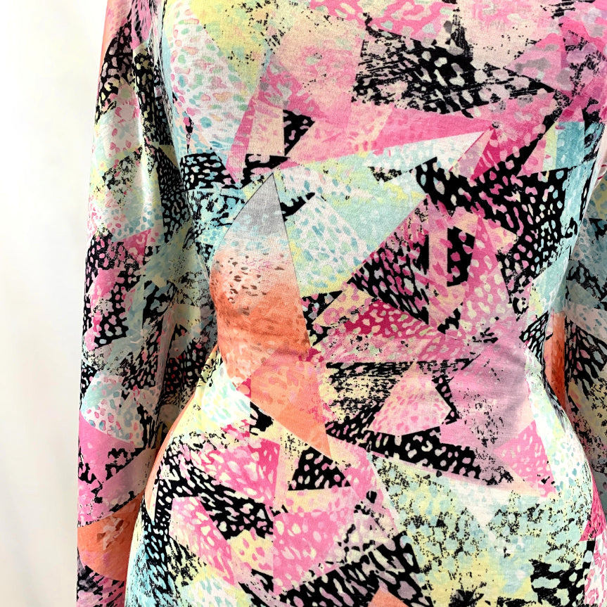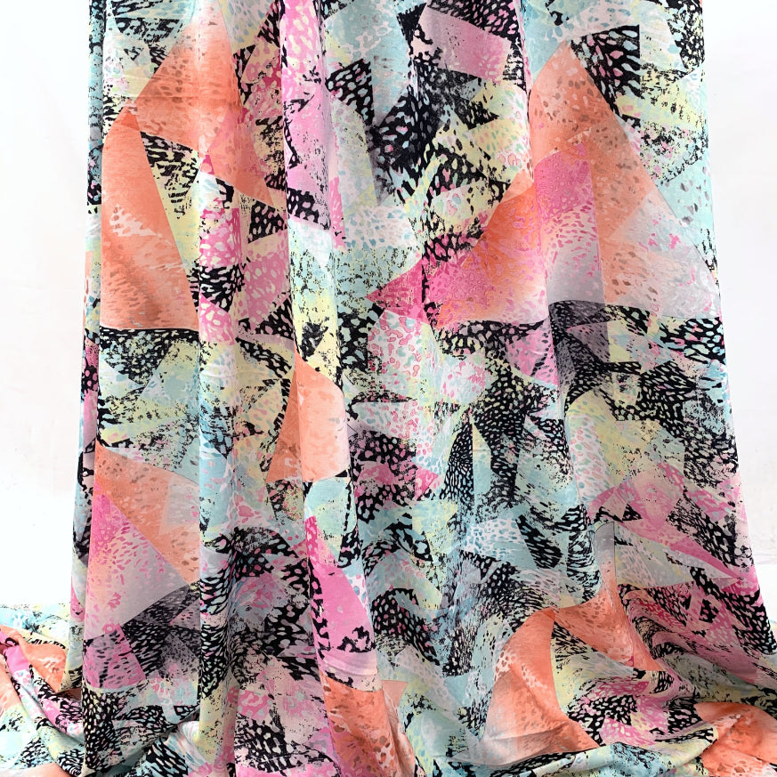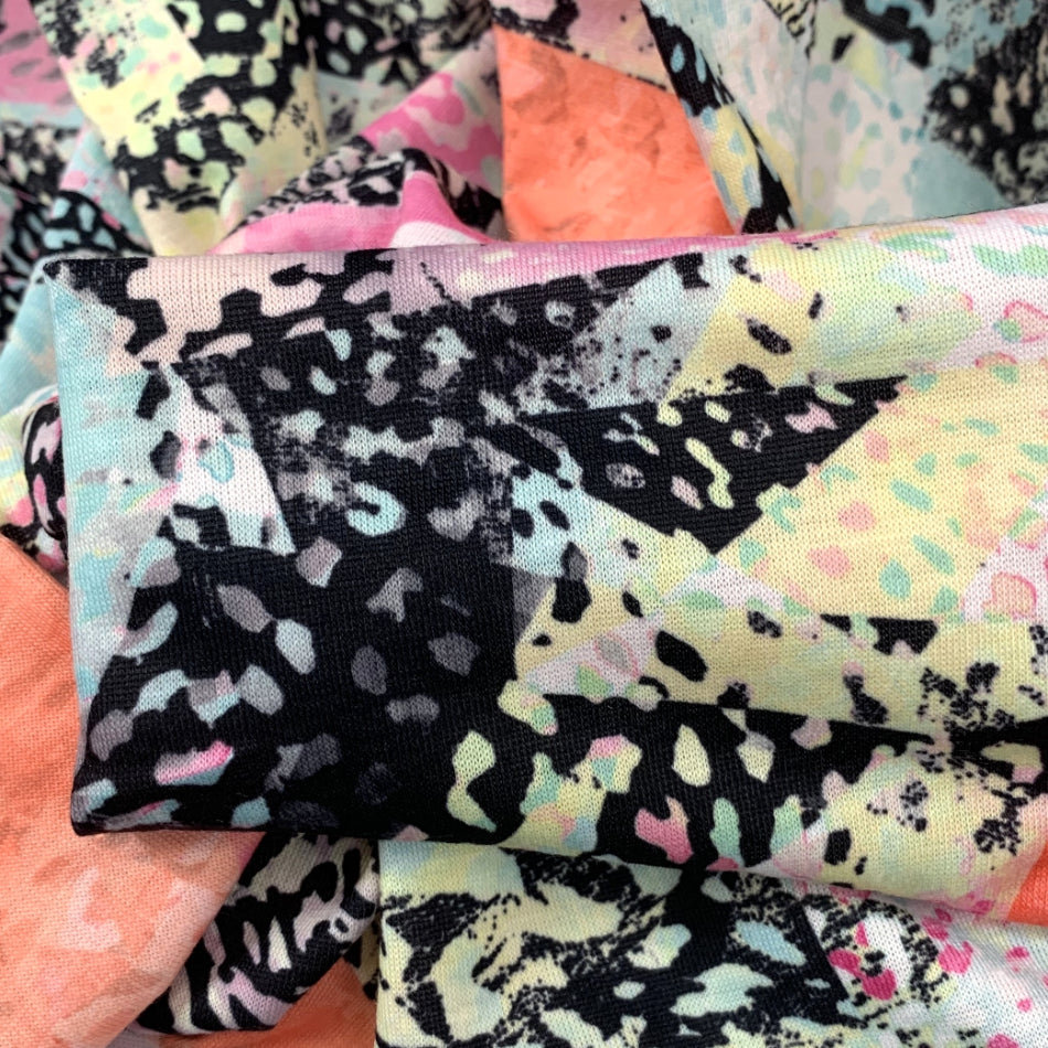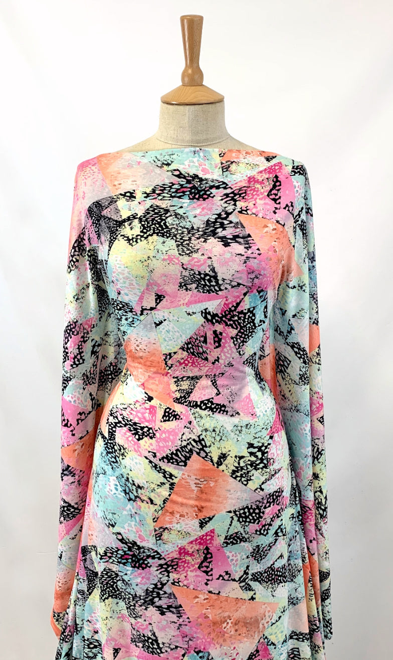 156cm very soft and brave to wear, lightweight polyester jersey with an abstract pattern in in neon yellow, pink, bright coral and some mint and black and white. So fine it would be a "the-light" (delight) to wear.