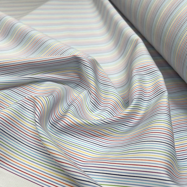 This 100% cotton dress fabric features a delicate, fine rainbow stripe running across a clean white base, giving it colour without shouting. The stripes are closely spaced and softly toned, so it reads fresh and easy to wear rather than novelty, with a smooth handle and a lovely fluid drape.