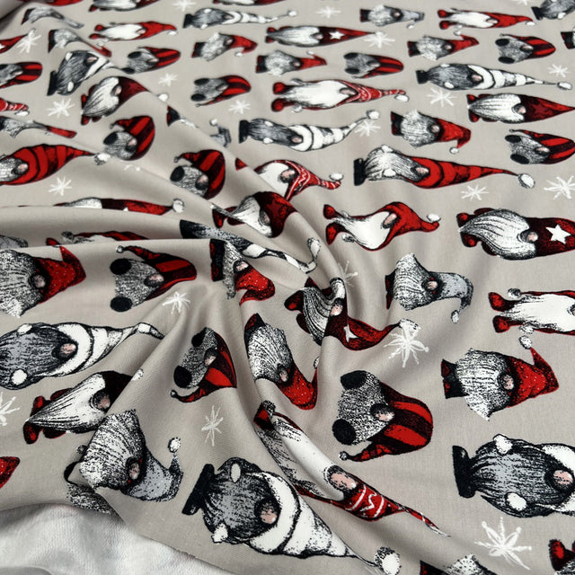 A soft and comfy cotton French terry with a cheerful festive gnome print on a sand background, perfect for cosy makes through the winter season. The looped back gives it that classic French terry feel — warm without being heavy — and the added elastane brings a nice bit of stretch for everyday wear.