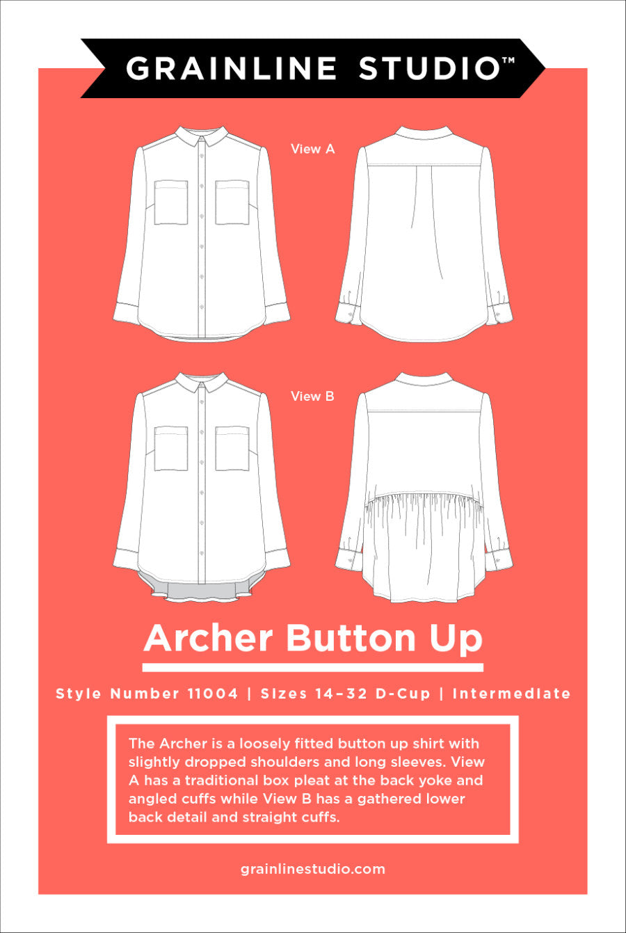 The Archer Button Up shirt is a relaxed fit shirt with long sleeves and slightly dropped shoulders. It comes in two views, View A features a classic box pleat at the back yoke and angled cuffs while View B has a gathered lower back detail and straight cuffs. This pattern involves various sewing techniques such as sewing straight seams, setting sleeves, creating continuous button plackets, adding a shirt collar, and inserting buttons and buttonholes.