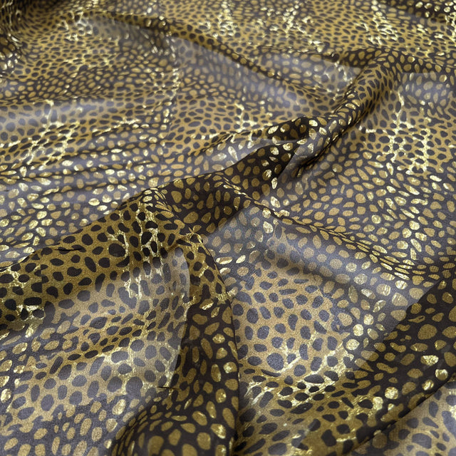 A lightweight viscose dressmaking fabric with a sheer finish and an all-over abstract snake-style spot design, printed in khaki and olive tones with darker accents that give it depth and movement. The cloth has a soft, fluid handle and a delicate, floaty drape that creates gentle folds and a subtle sense of transparency.