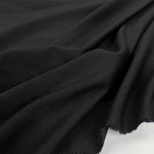 A deep black jersey with an exceptionally soft, fluid handle and a smooth, matte surface. The viscose-rich blend gives it that cool, almost buttery feel against the skin, while the polyamide adds durability and the elastane brings comfortable stretch. It drapes beautifully and has a slightly sultry quality, making it ideal for garments that sit close to the body and move with you.