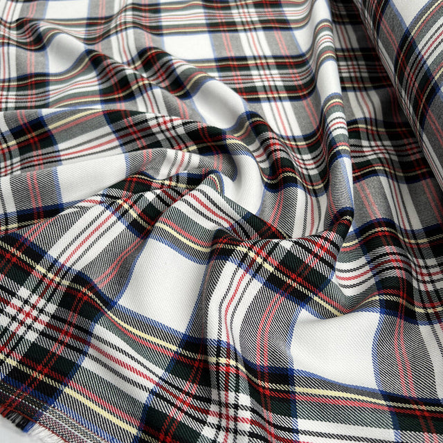 This checked polyester fabric features a bold woven design in blue, black, red, and white, perfect for creating eye-catching garments and accessories.