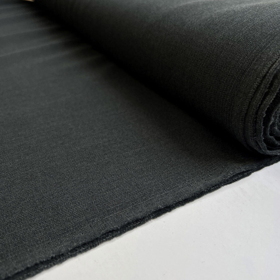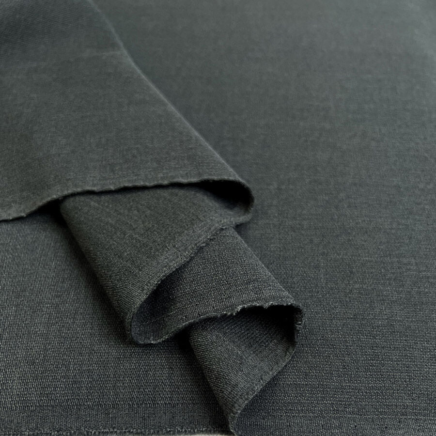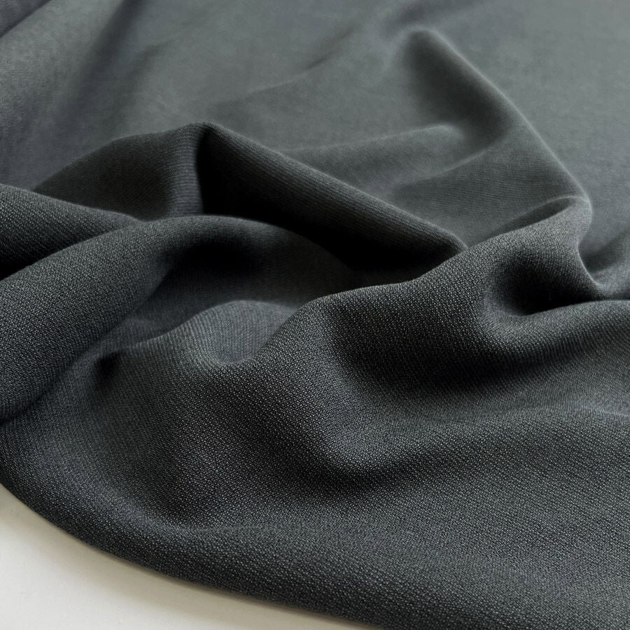 A sturdy 55% wool, 45% polyester woven suiting fabric in a subtle Gunmetal Olive shade — a clever mix of grey, metal, and soft green tones. It’s a solid, good-handling cloth with a smooth feel and just the right amount of weight for structure and durability.