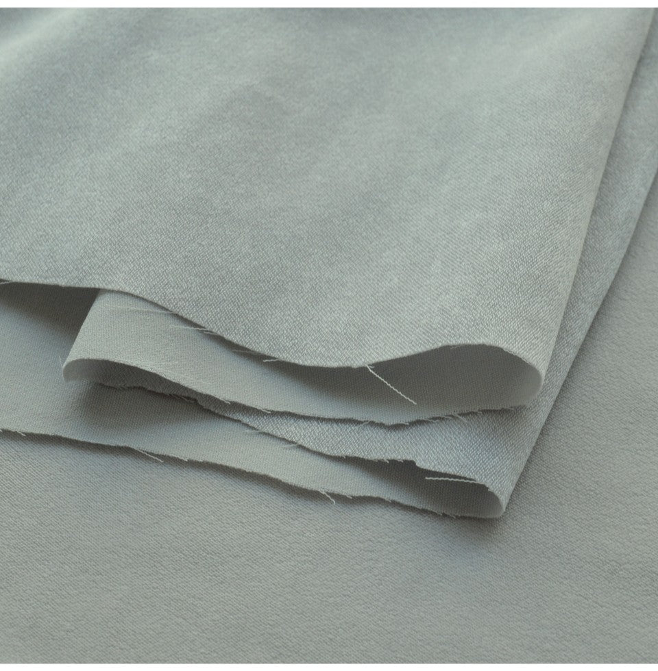 | 148cm wide, plain polyester fabric in steel grey from John Kaldor, a beautiful colour enhanced by the way the cloth has been finished, which has highlights, fairly well hidden it has to be said, but highlights non the less to accentuate movement. Tight as you like with big wedges, about calf length so you can’t sit down. | |