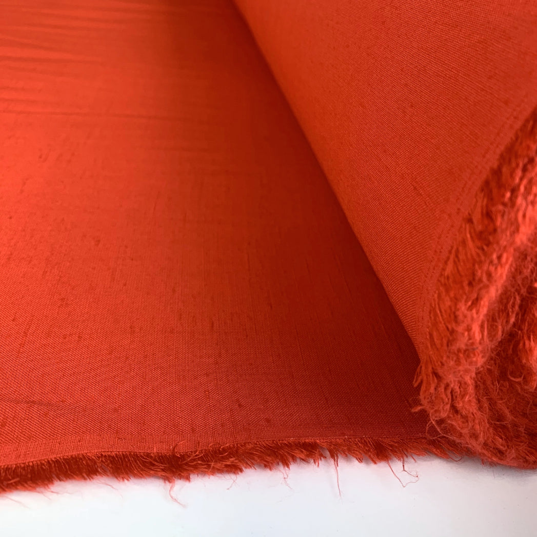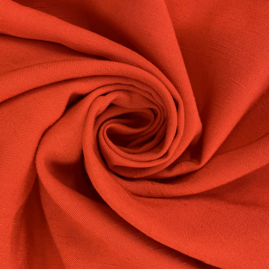 Don't be fooled. This is a superb imitation of a linen. Bright coral red polyester linen look suiting made in Portugal.