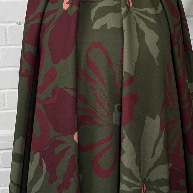 Printed with a large-scale burgundy floral pattern on a dark khaki green base.