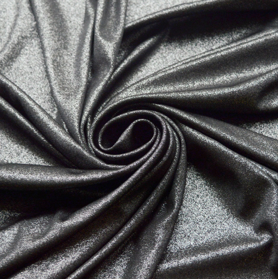 | 145cm wide dark silver very fine polyester dress fabric with boodles of stretch, and the silver is in fact printed on a black cloth so it is not bright silver but still has quite a sheen to it. | |