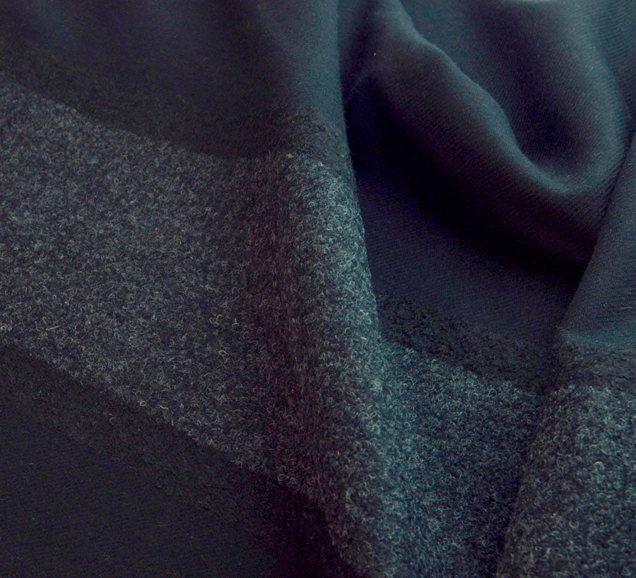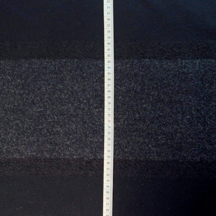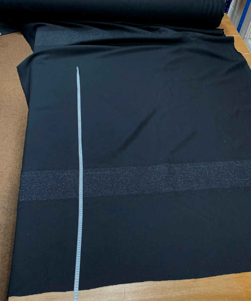 | This fabric is sold in panels, each panel is 1.4 m. Please have a look at the photo of the fabric showing the full length. The stripe boucle stripe starts at about 40 cm from the bottom of the panel. Just a little element of cold war Europe in this cloth – the spy who came in from the cold. An unwelcoming place when men who skulked for both sides wore dark coats made of very heavy cloth. This particular cloth is very heavy and it comes in black with a panel of grey marl boucle which is about 20 cm wide. | |