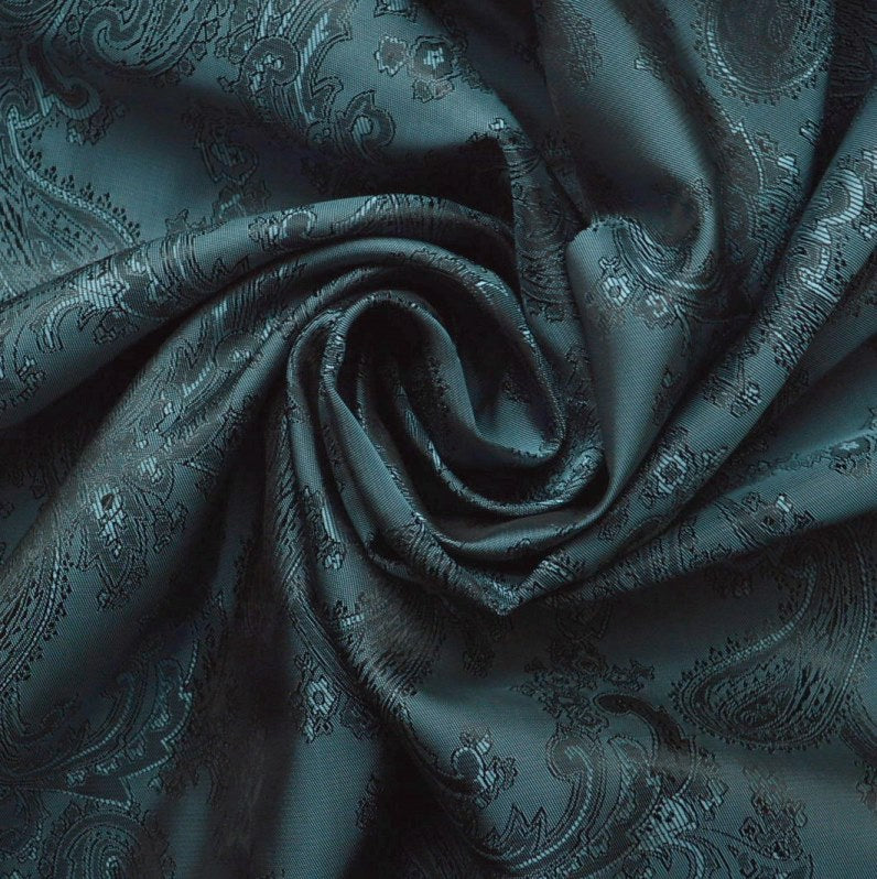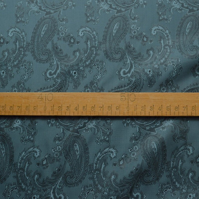 Superb quality 146cm wide jacquard lining fabric with a captivating paisley design in slate grey. Crafted from 54% polyester and 46% viscose. This cloth drapes elegantly and boasts a subtle metallic sheen, adding a touch of sophistication to any project.