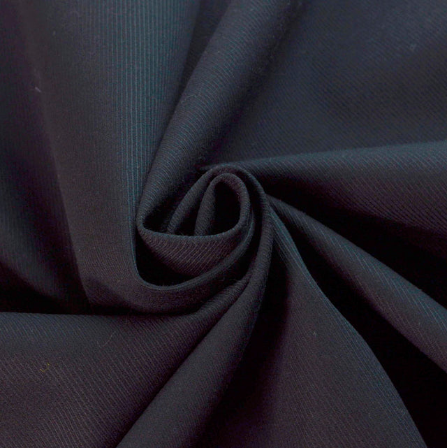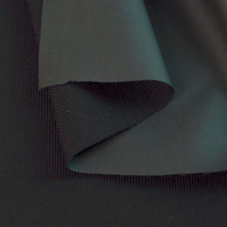 | Black polyester cavalry twill with a synthetic rubber backing, fairly substantial and would probably make “bikers leathers” it looks to me as though it will be very hard wearing, somewhat weather proof and fairly protective. | |