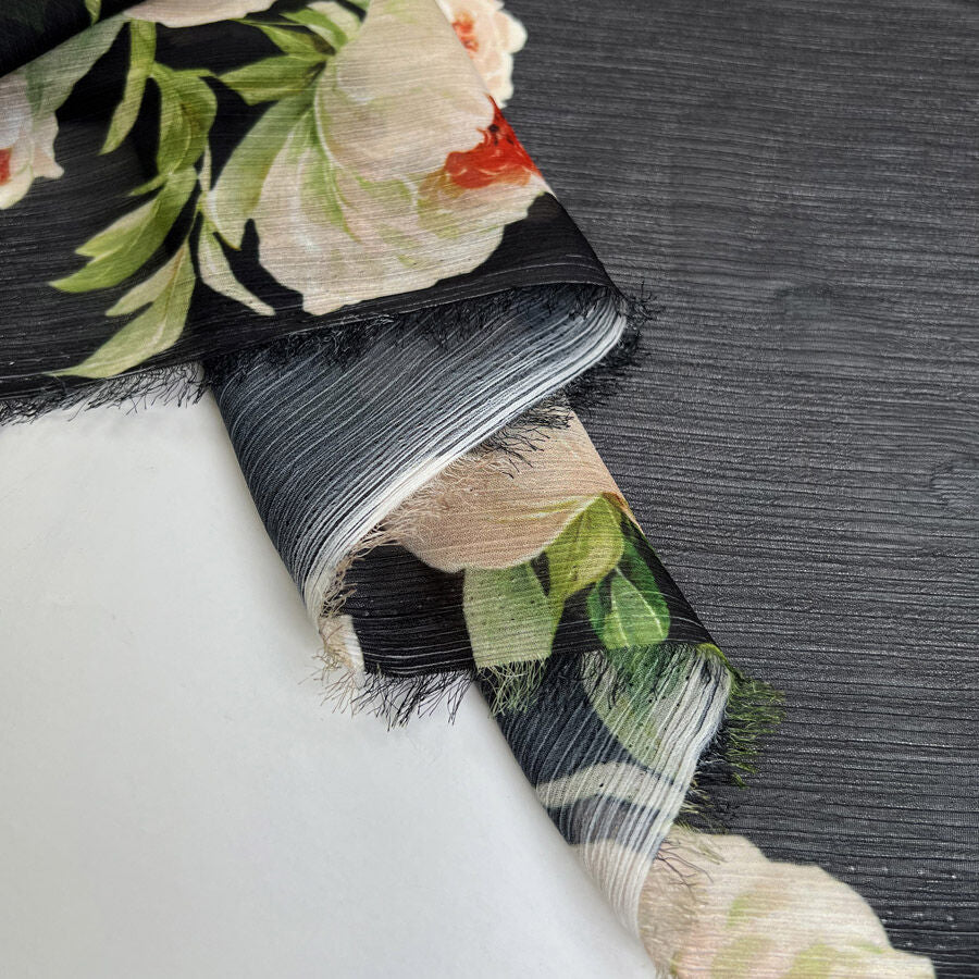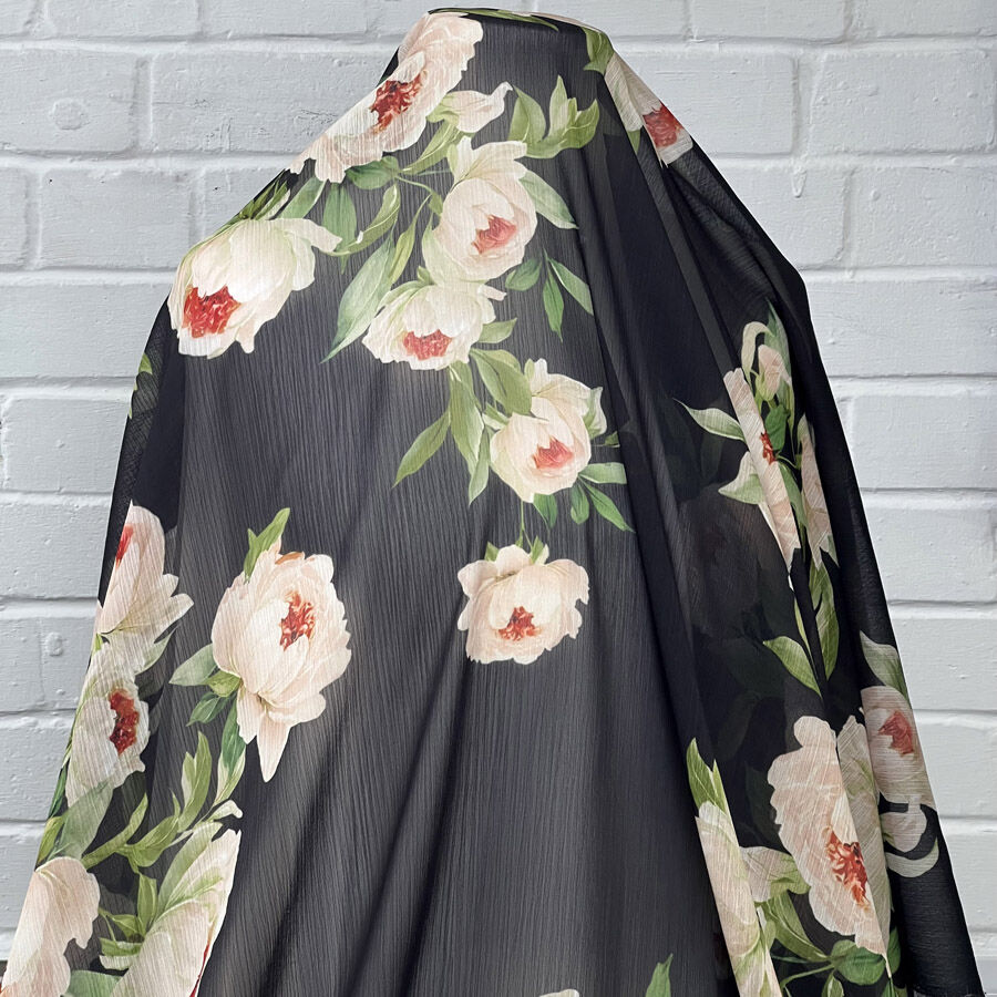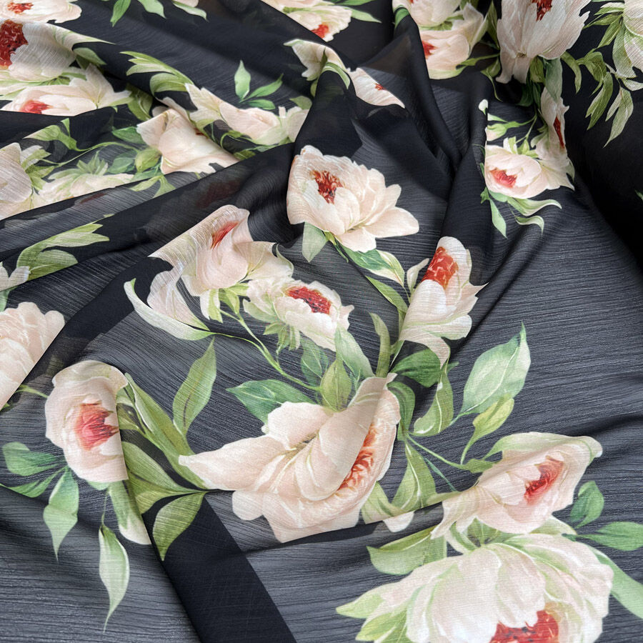 Light, airy, and beautifully drapey, this floral printed georgette is perfect for soft, feminine garments. Made from a blend of 60% polyester and 40% viscose, it offers a semi-sheer finish with a gentle texture and fluid movement.