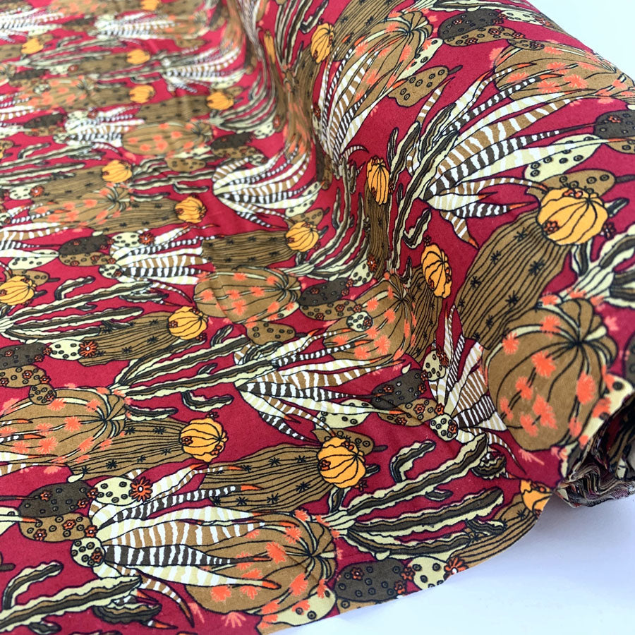 Red Pima cotton lawn with hand-drawn like cacti/cactus pattern all over the deep red background.