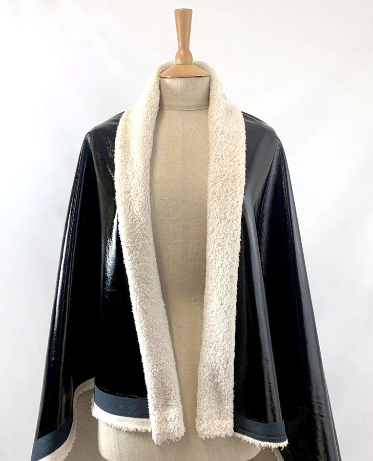 Super cosy, black water resistant high shine faux leather fabric, with a fur lining...