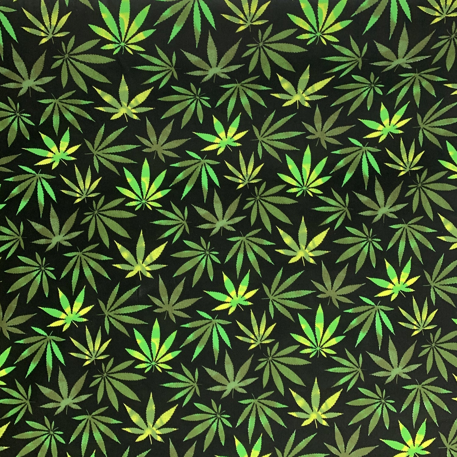 110cm wide green cannabis leaf print on a black background.