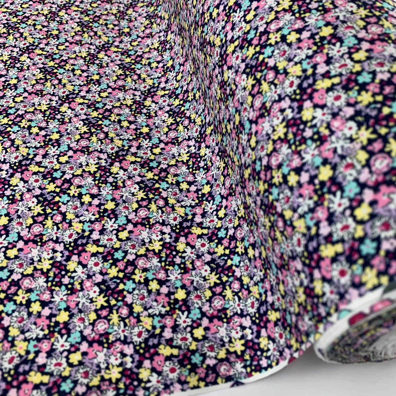 112cm wide, good quality 100% cotton poplin with small multicoloured floral design on a navy ground.