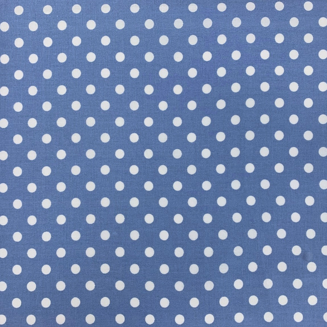 45” wide polka printed cotton poplin polka white spot print on pale blue. Approx 121gsm