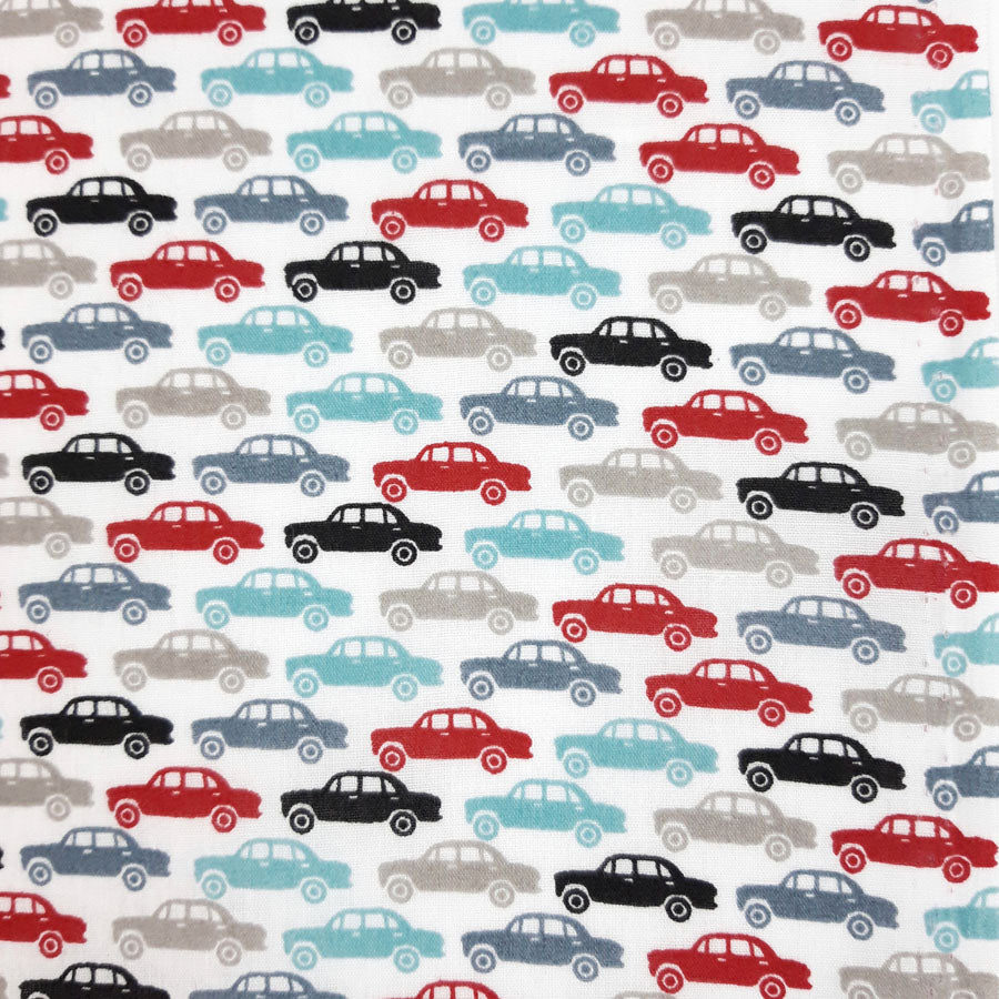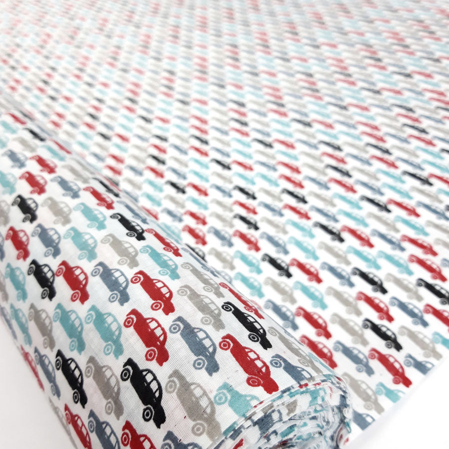 | 114cm wide, poly/cotton shirting and craft fabric, with simple car pattern in aqua blue, grey, beige, red and black printed on white. Perfect for making shirts, skirts & crafts. | |