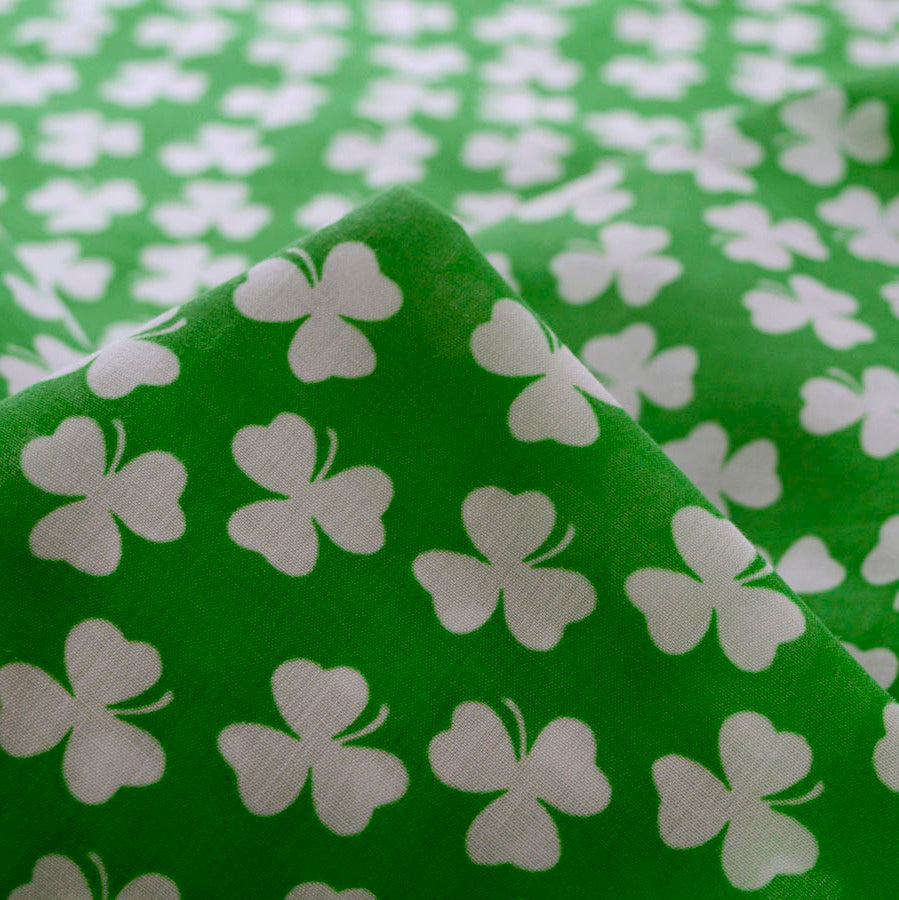 Poly cotton fabric with a lucky white clover print on a green background. Perfect for crafts. |
