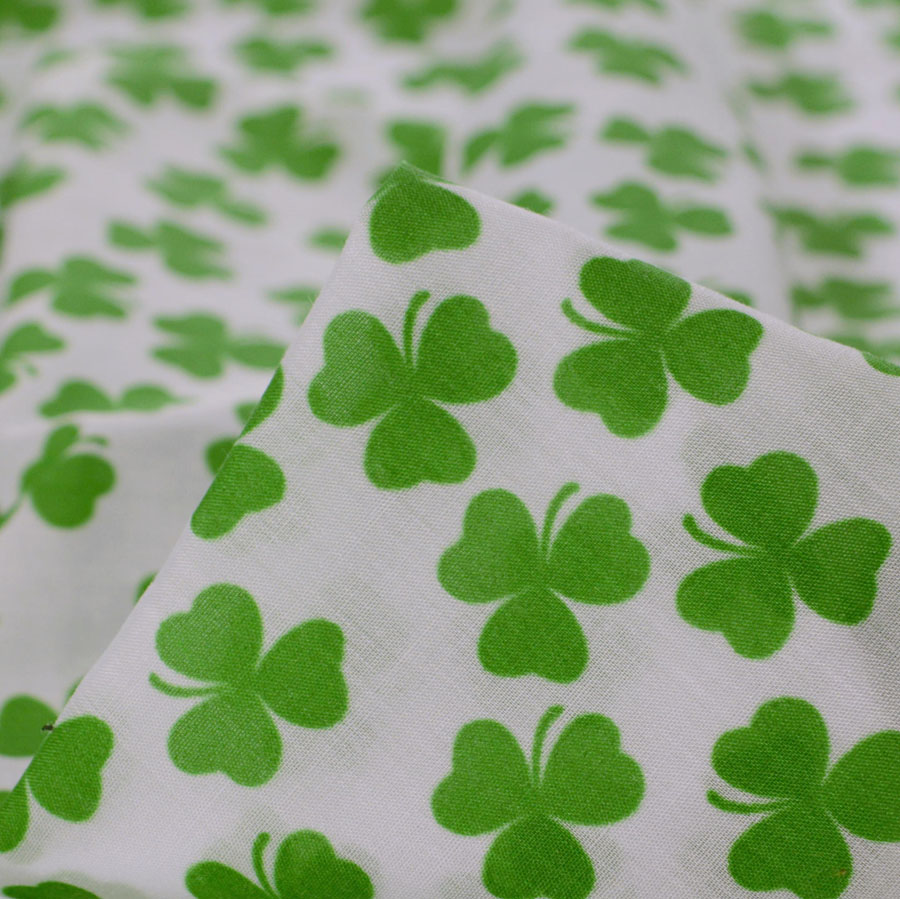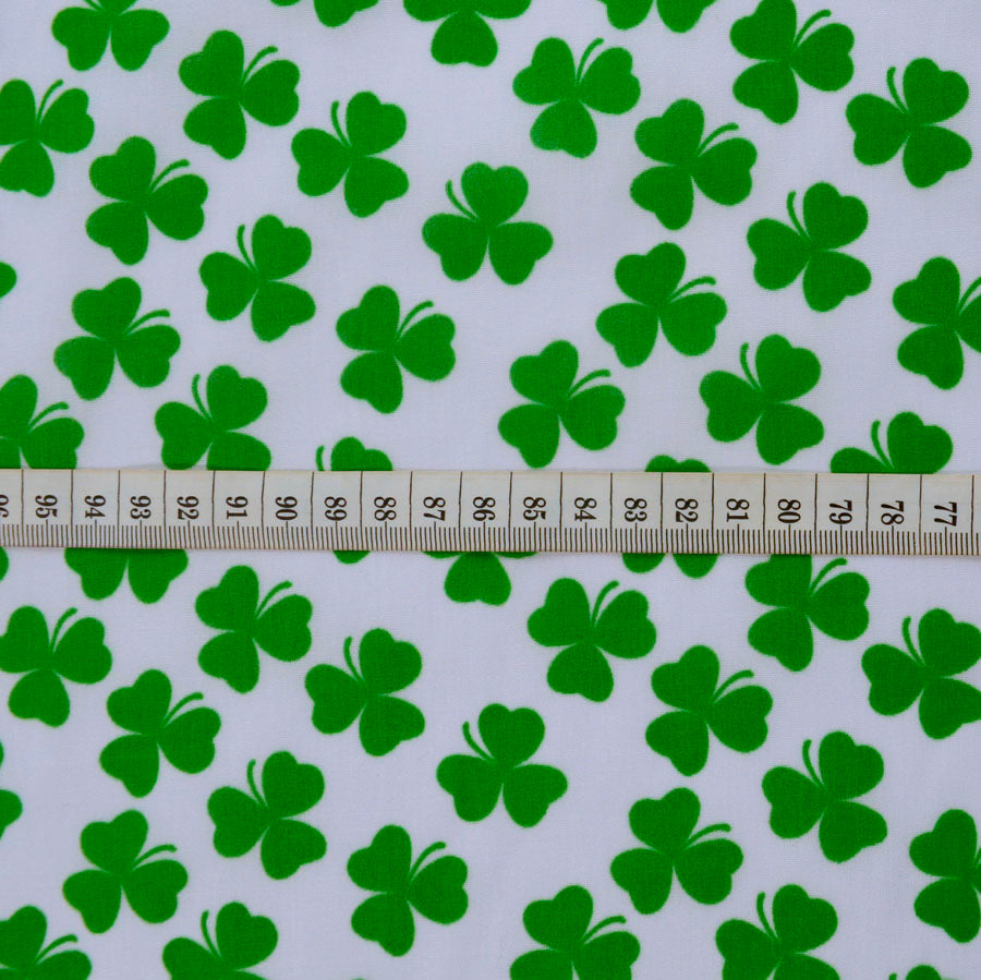 | Poly cotton fabric with a lucky green clover print on a white background. Perfect for crafts. | |