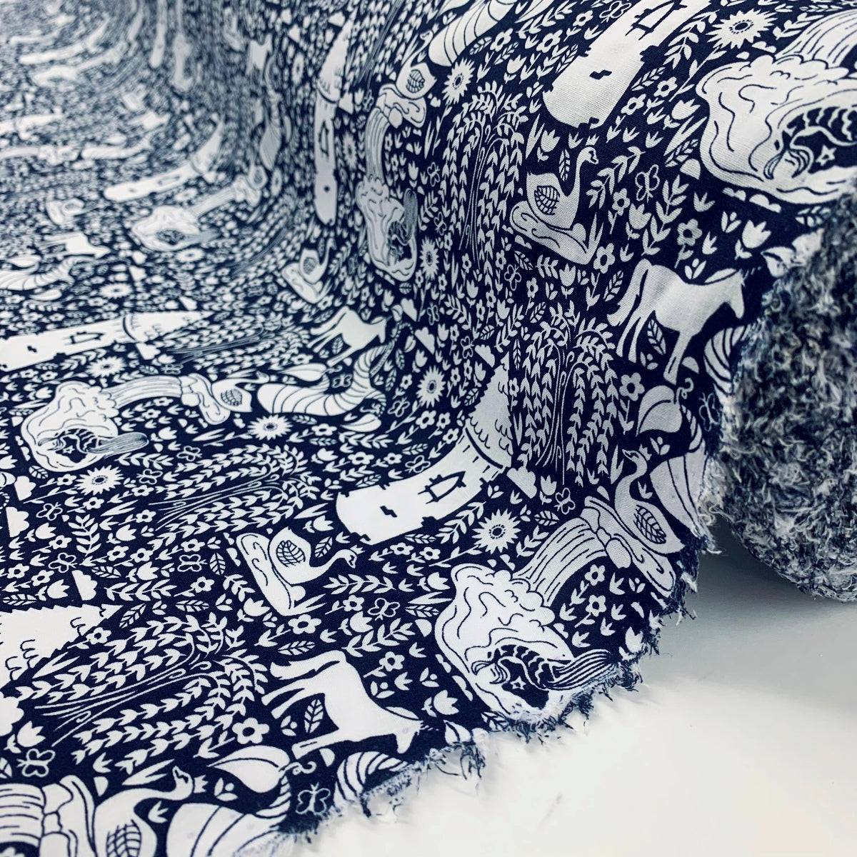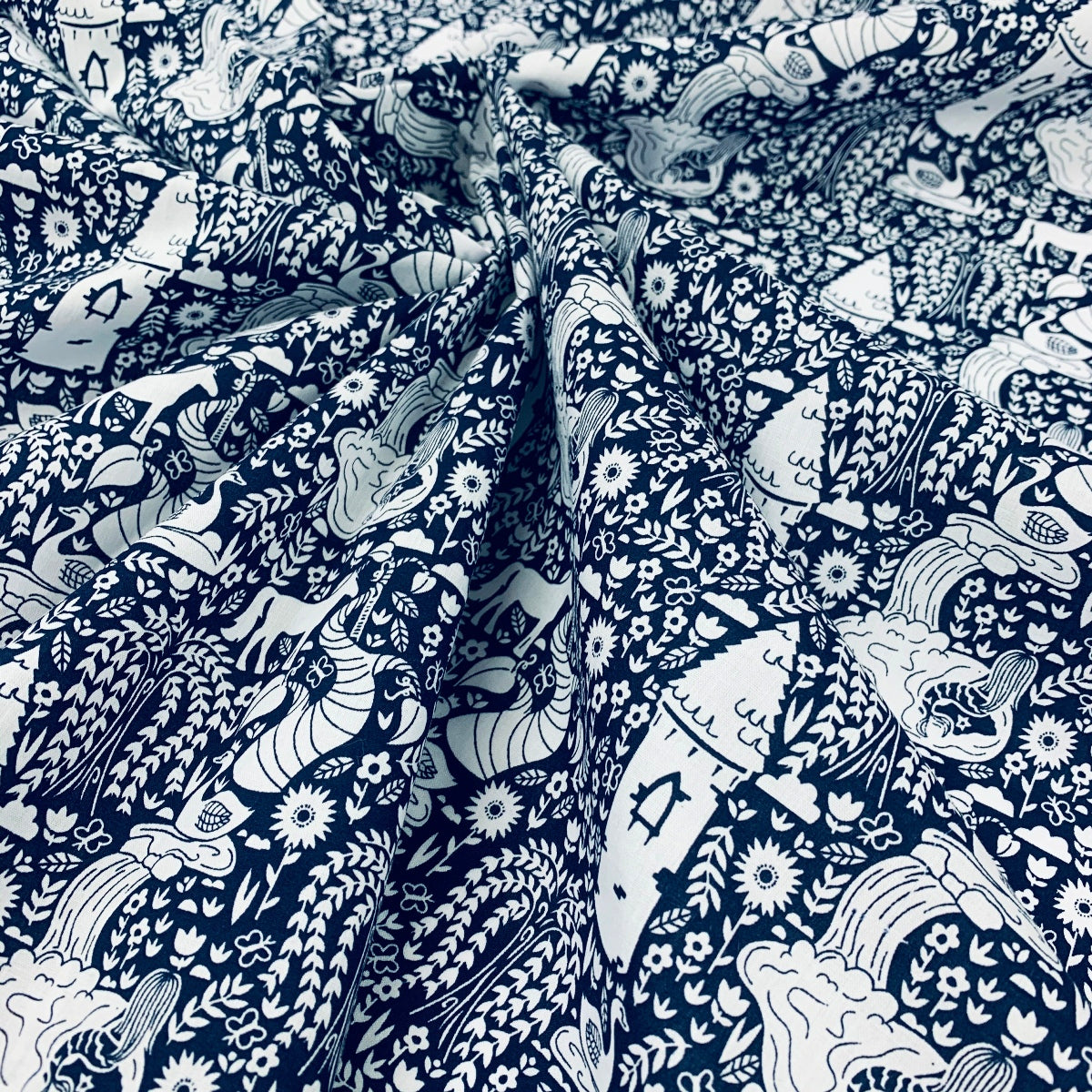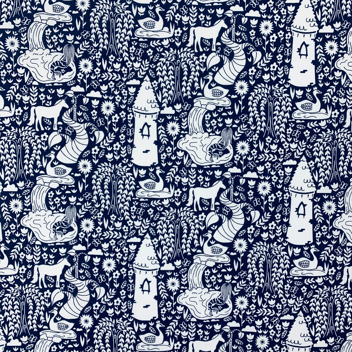 This 114cm wide, superior quality poly/cotton fabric features an all over fairytale pattern with castles and beanstalks in white on a navy background.