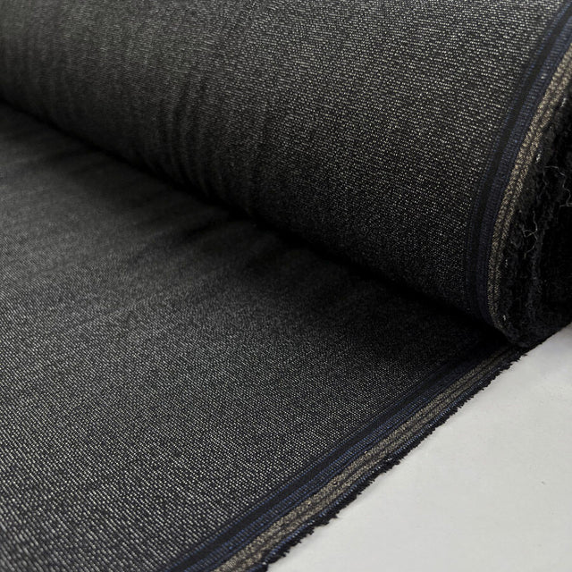 At 148cm wide, it features a subtle small white check against a deep charcoal ground, creating a timeless look that works for both casual and more structured pieces.
