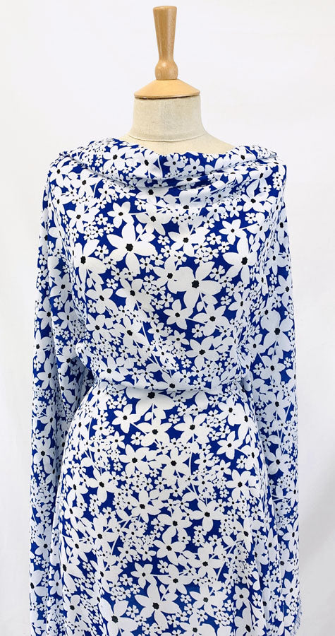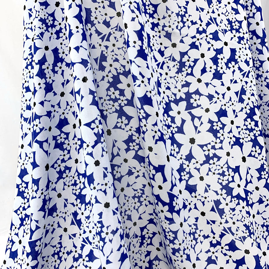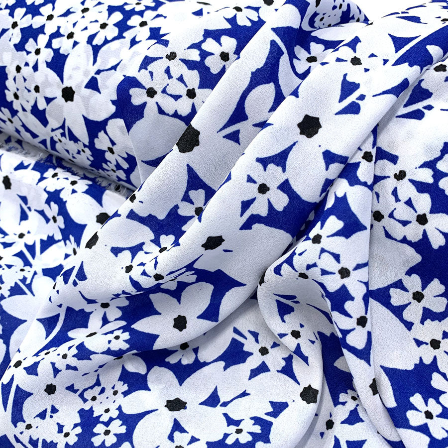 Lightweight georgette single crepe dress fabric in royal blue and black floral,