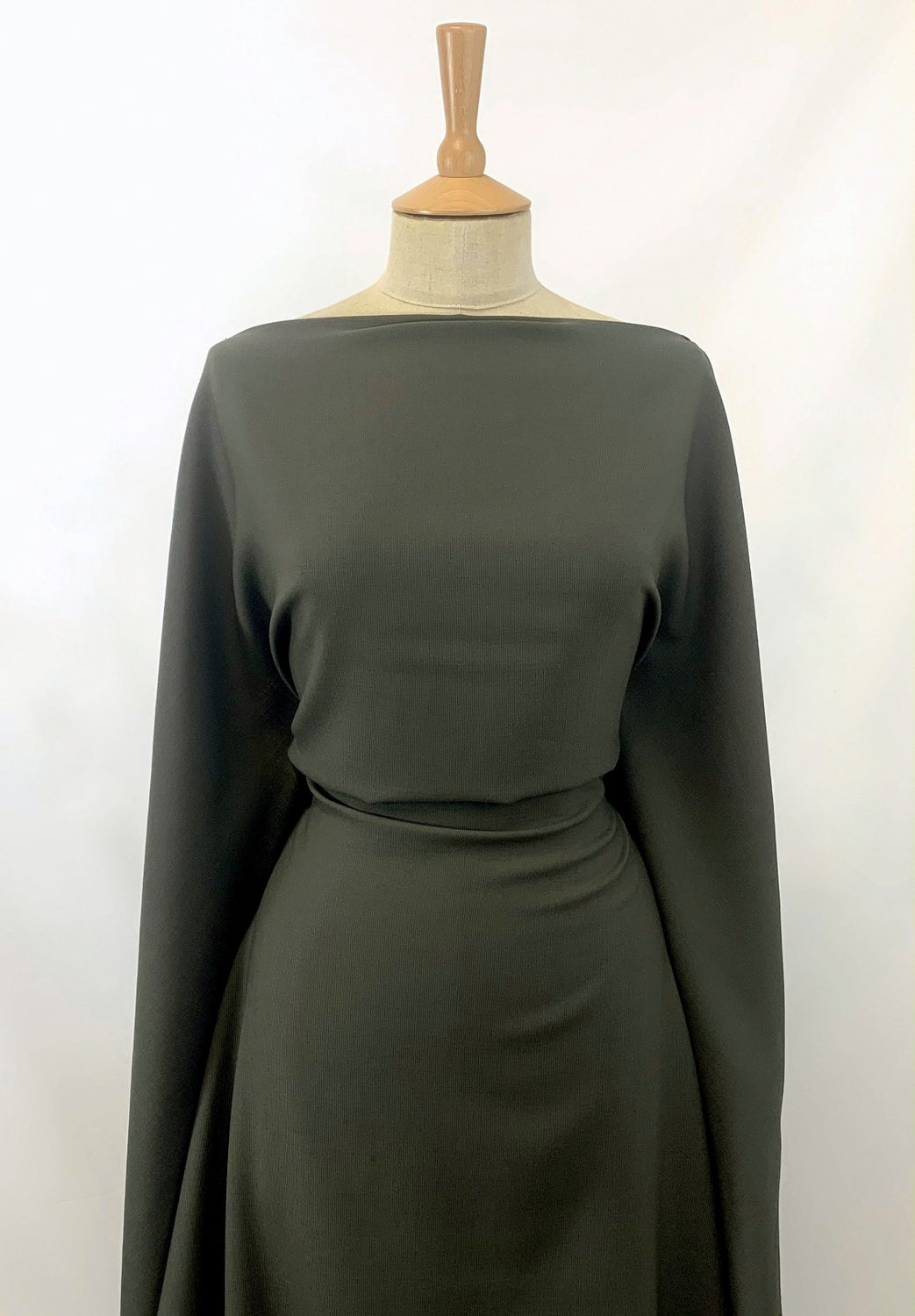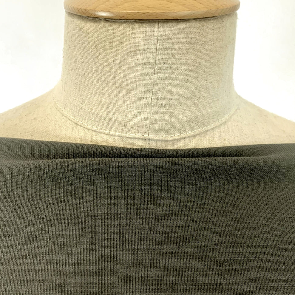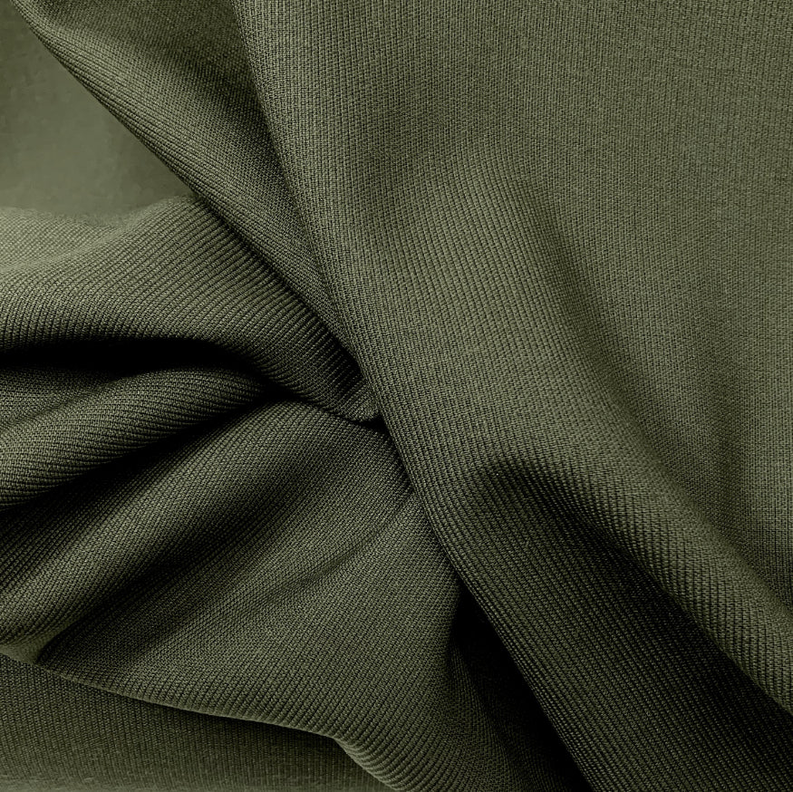 155cm wide, khaki ribbed wool/polyester mix suiting cloth, made in Yorkshire.