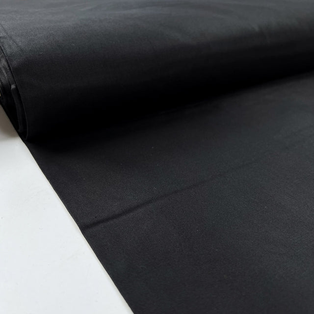 127cm wide, finest quality 100% cotton Silesia fabric in black, woven in Italy from premium Italian cotton. Traditionally used for lining and pocketing in military uniforms, this fabric features a plain flat weave with a subtle satinised finish for a clean, professional look.
