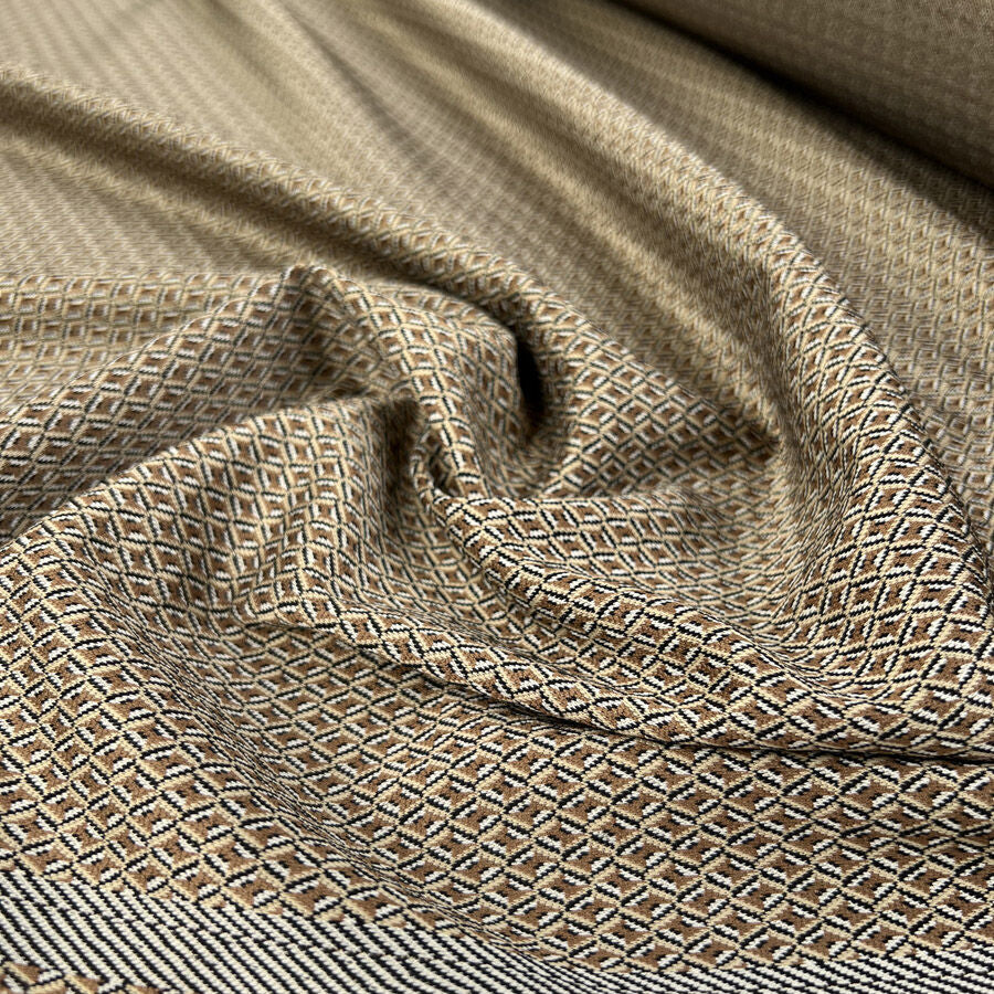 A sophisticated 153cm wide, Italian-knitted jersey made from 97% viscose and 3% elastane, featuring a fine diamond pattern in mushroom, black, and beige.