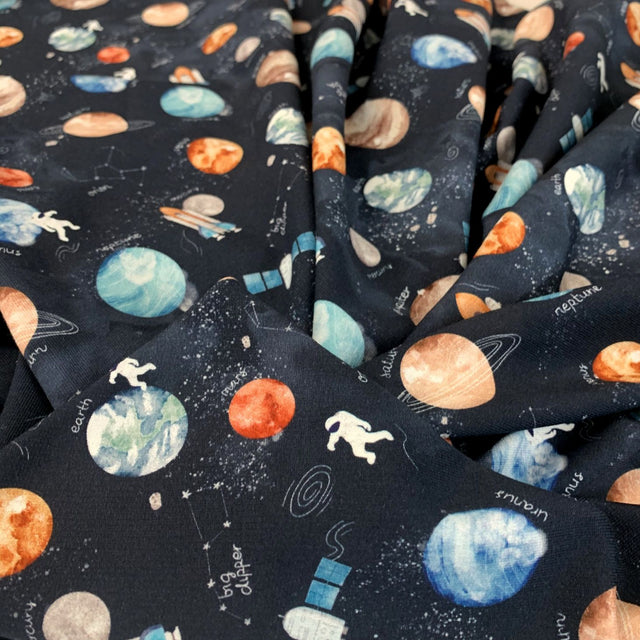 145cm wide, Organic and Oeko-Tex 100, 95% Cotton / 5% Elastane knitted jersey fabric with an all over space themed print.