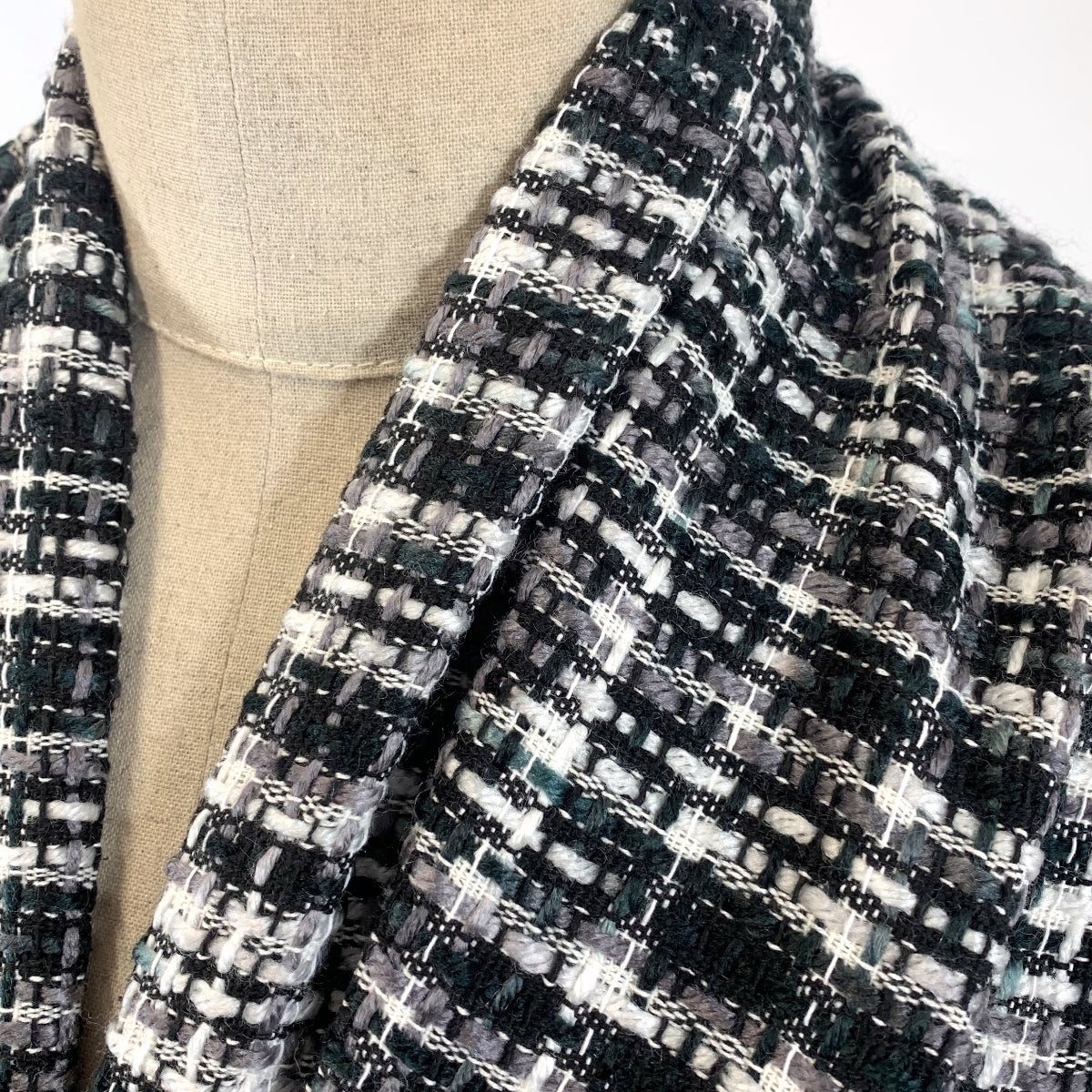 Chunky tweed jacketing and coating fabric in a large check design in black, grey and white yarns with a tiny hint of teal.
