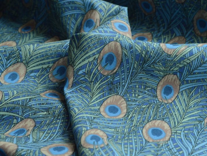 140cm wide blue peacock feather print on a stunning cloth. This is in our 100% Cotton Mercerised Pima Cotton Lawn range, which for those of you that know, excuse the blushing description to follow. It is basically superior quality to normal lawn, the yarn is made from extra long staple cotton and is combed and extra fine, the combination of all of this, and a dense yarn count gives you beautifully fine (not thin) silk like cotton. Softer than a poplin because the yarn is much finer. This allows for (in our opinion) a better drape, but this can be a personal choice.
