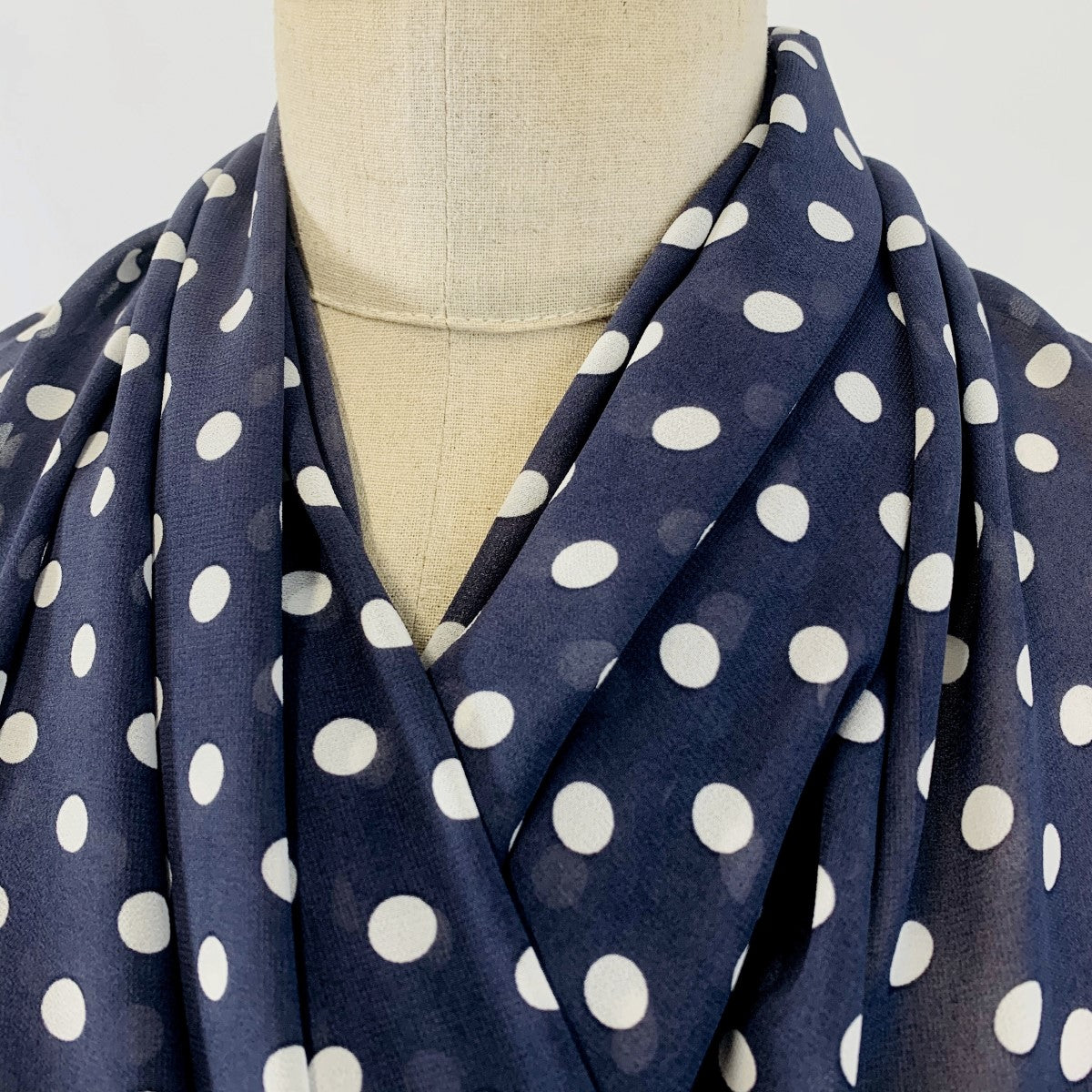 Printed, grey polyester chiffon with an all over, white polka dot pattern.