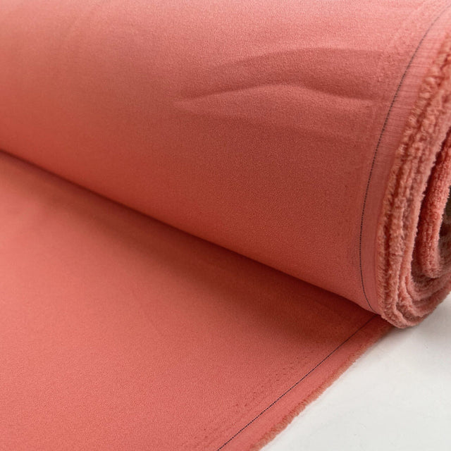 150cm wide, 95% polyester and 5% elastane crepe suiting fabric in a vibrant coral shade. This high-quality fabric is easy to handle, sew, and care for.