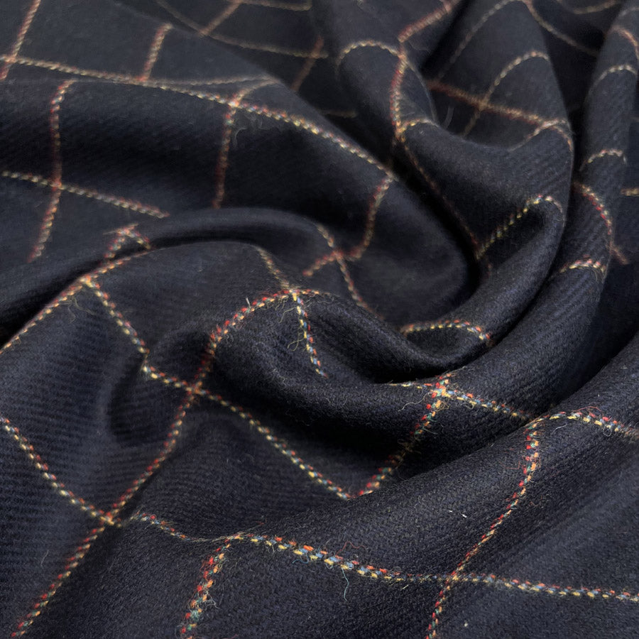 Our sophisticated, 100% wool fabric in a dark navy hue offers the perfect blend of durability and warmth. This fabric features a finely woven check made up of green, red and yellow yarns, all close together to form a single line overcheck.