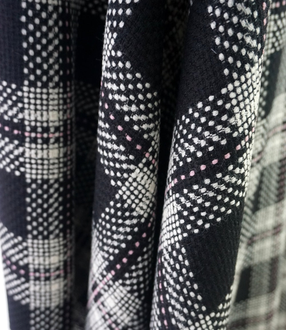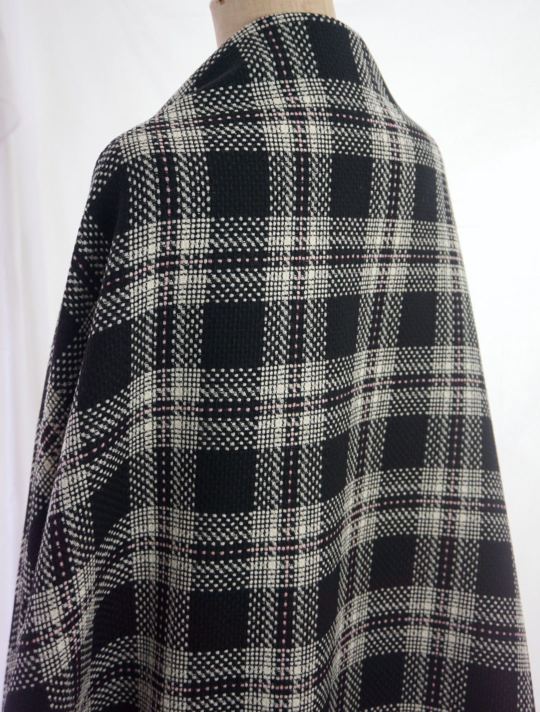 | 150cm wide 80% wool 20% polyester soft finish suiting in a little bit of a complicated black and white check. The checkered parts are made up of lots of smaller dots and then to cap it all there’s a bit of a pink dotted over check, maybe it’s a bit formal but with a pair of black trousers what could be better. | ||