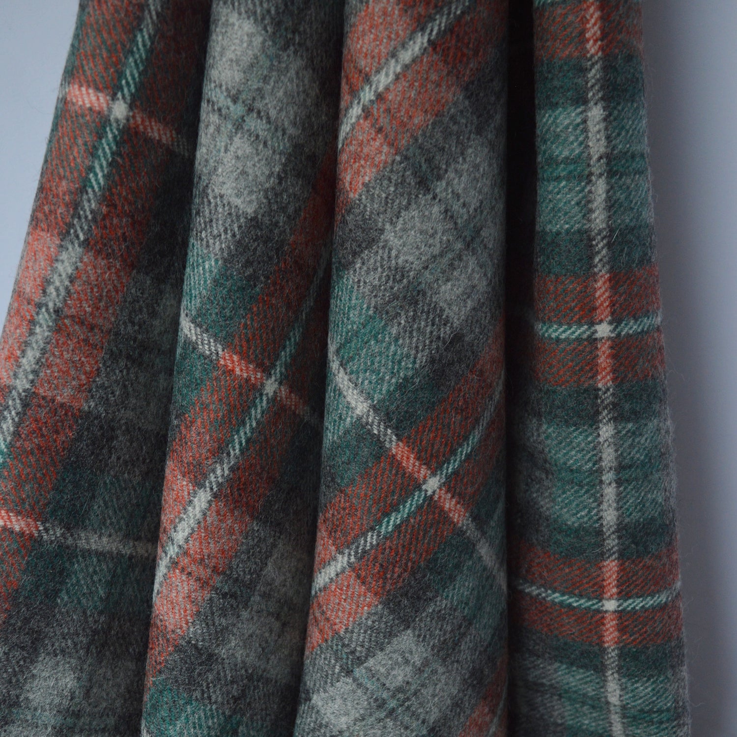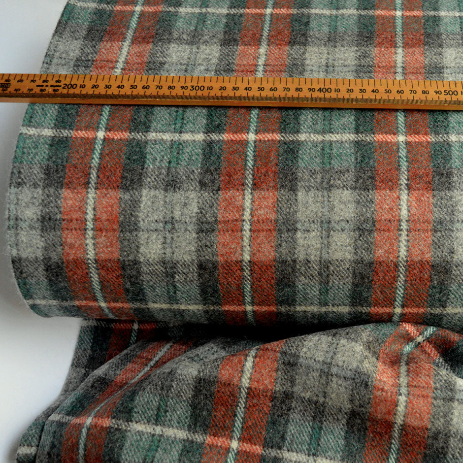 A beautiful British flat tweed woollen check jacket cloth, the colourways are toned down somewhat. It comes in a quite positive check in shades of, rust, green, dark grey, pale grey and some white. The check itself probably makes squares of 10cm divided by smaller squares in between. |