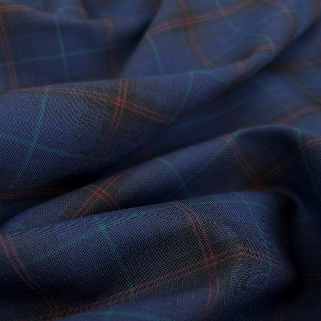 Our 150cm wide fabric exudes an air of understated luxury that suits any occasion, from formal affairs to refined daily wear. The delicate check pattern lends a touch of visual interest, showcasing a subtle interplay of different shades of blue and red overcheck threads.