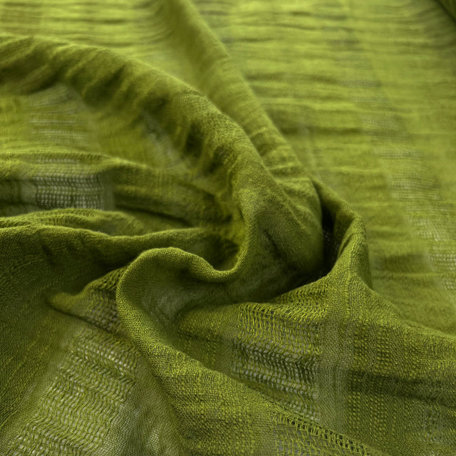 A lightweight cotton linen blend in a rich pickle green shade, with subtle stripes running across the weft that add texture without overwhelming the fabric. The open, slightly gauzy weave gives it a relaxed, airy feel, while the mix of cotton and linen keeps it breathable with a softly crisp handle. The colour has an earthy depth that works well for warm-weather sewing and easy, natural styles.