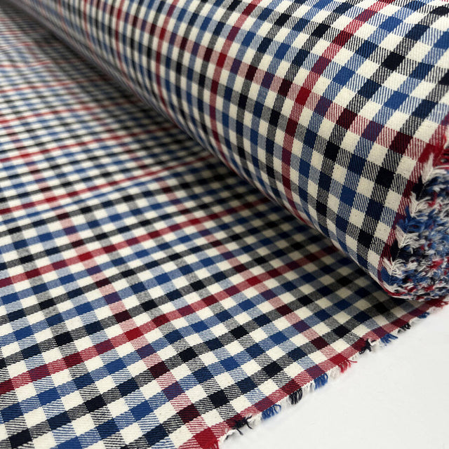 Timeless and full of character, this Italian-made ex-designer cotton check fabric is woven from 100% cotton for a soft, breathable finish. The bold check pattern in red, blue, navy, and cream adds a fresh yet classic feel—perfect for year-round dressmaking. At 150cm wide and 140gsm, it’s lightweight, easy to sew, and ideal for shirts, dresses, skirts, and casual tailoring. A beautiful Italian deadstock fabric, sold by the metre.