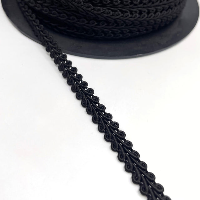 This black scrolled gimp braid trim is designed to elevate your creative projects with its unique blend of cotton and viscose, resulting in a fairly thick braid that exudes both softness and suppleness.