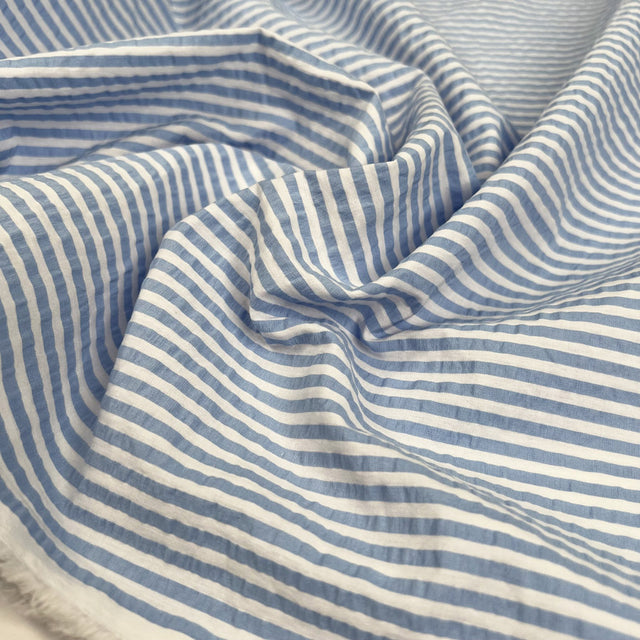 A lightweight cotton seersucker dressmaking fabric with a classic sky blue and white stripe, woven to give that gently puckered texture seersucker is known for. The surface has a soft, dry handle and subtle rippling that lifts the fabric away from the skin, giving it an airy feel while keeping the stripes crisp and well defined.