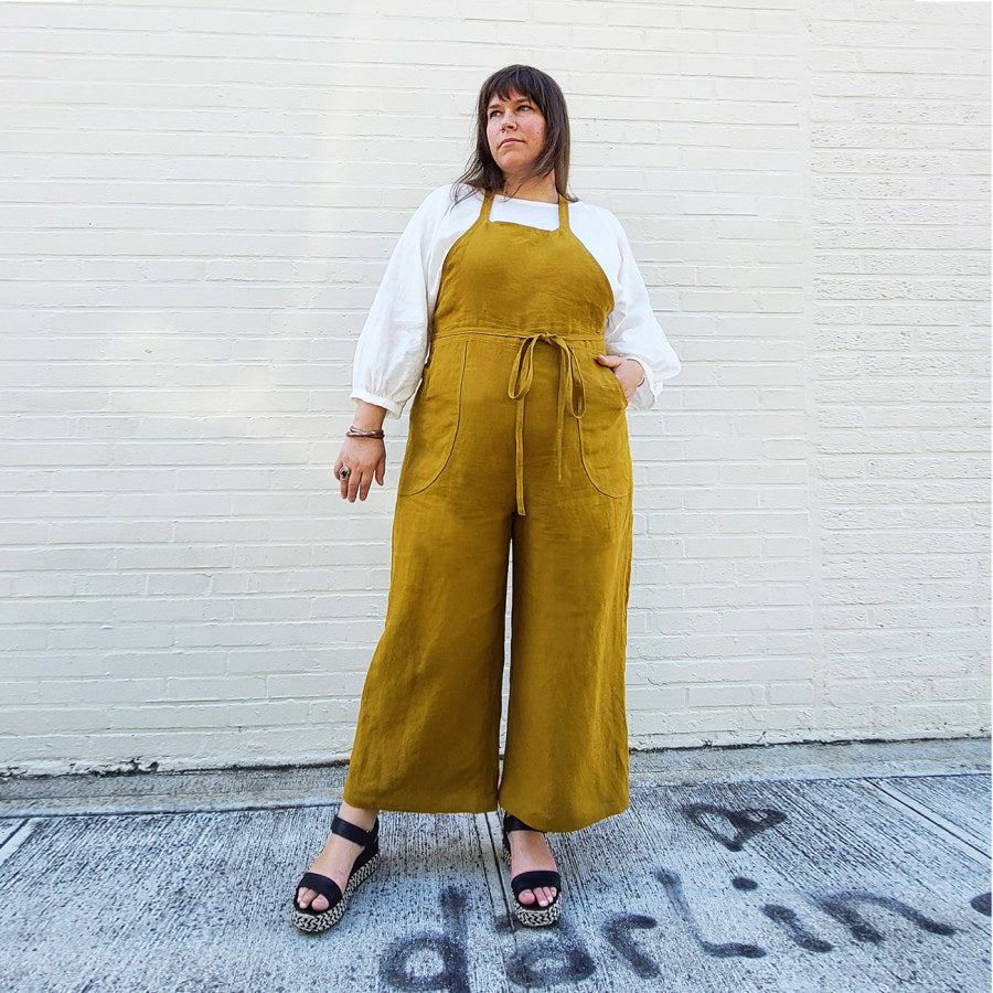 Both versions of the Burnside Bibs also feature a front waistband, curved front patch pockets, optional back pockets, and cross-back straps that transition to narrower ties that thread through back waist belt loops, forming back waist gathers. The straps can be tied in various ways, including at the back, front, or sides. The wide leg can be made full length or cropped, depending on your preference.