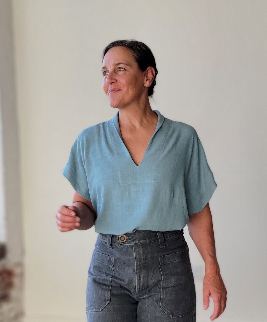 The Revel Topper is a simple boxy top that is just long enough to tuck into a high to mid-rise bottom. Its unique feature is the shawl collar and front yoke facing.