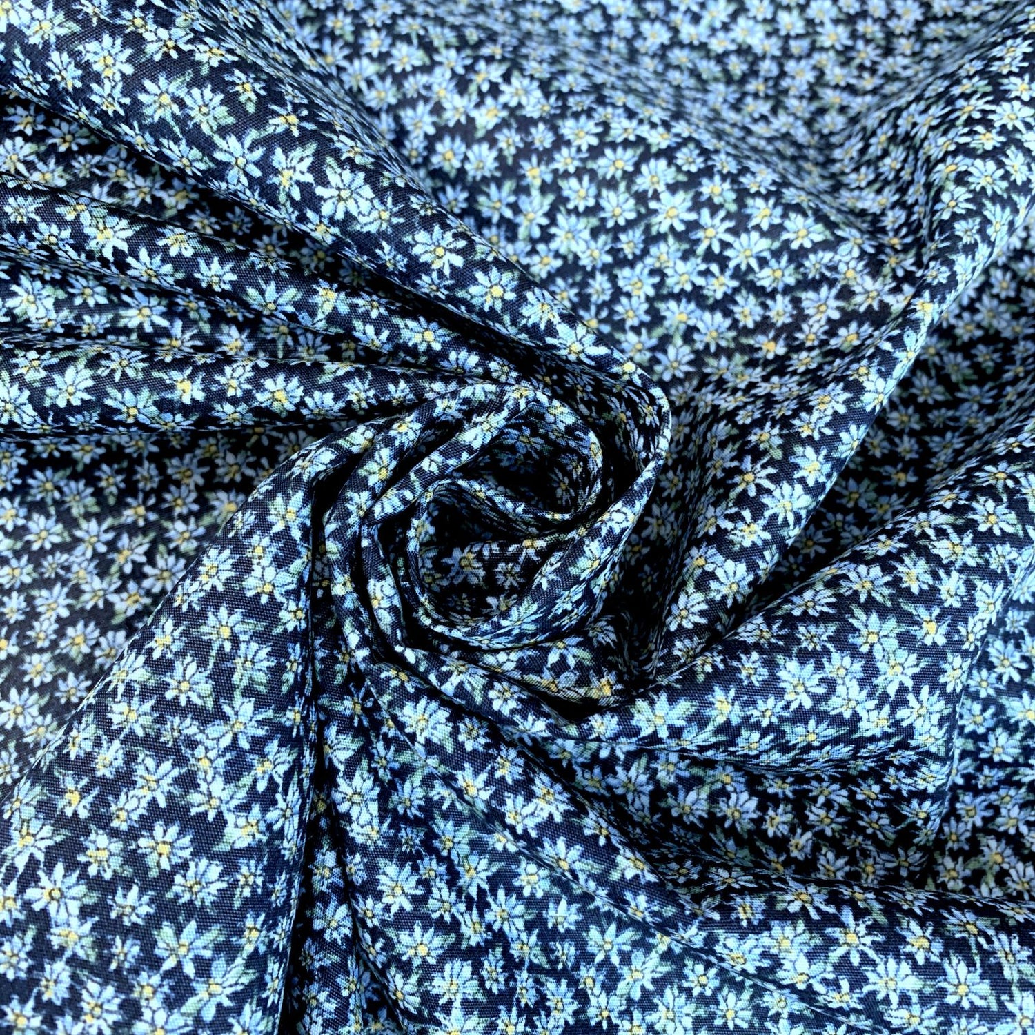 100% cotton poplin fabric with tiny flowers on a navy background.
